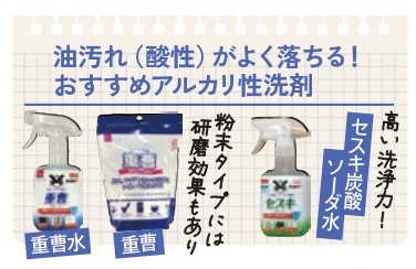 酸性の油汚れには、アルカリ性の洗剤がよく効きます!特にセスキ炭酸ソーダは、高い洗浄力がありおすすめです!