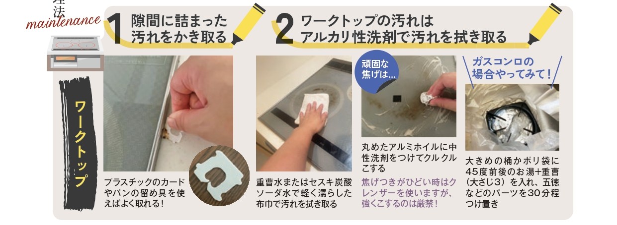 ワークトップの隙間にたまった油汚れや食べ物のカス。これがニオイのもとになっているのかも!ぜひやってみて!