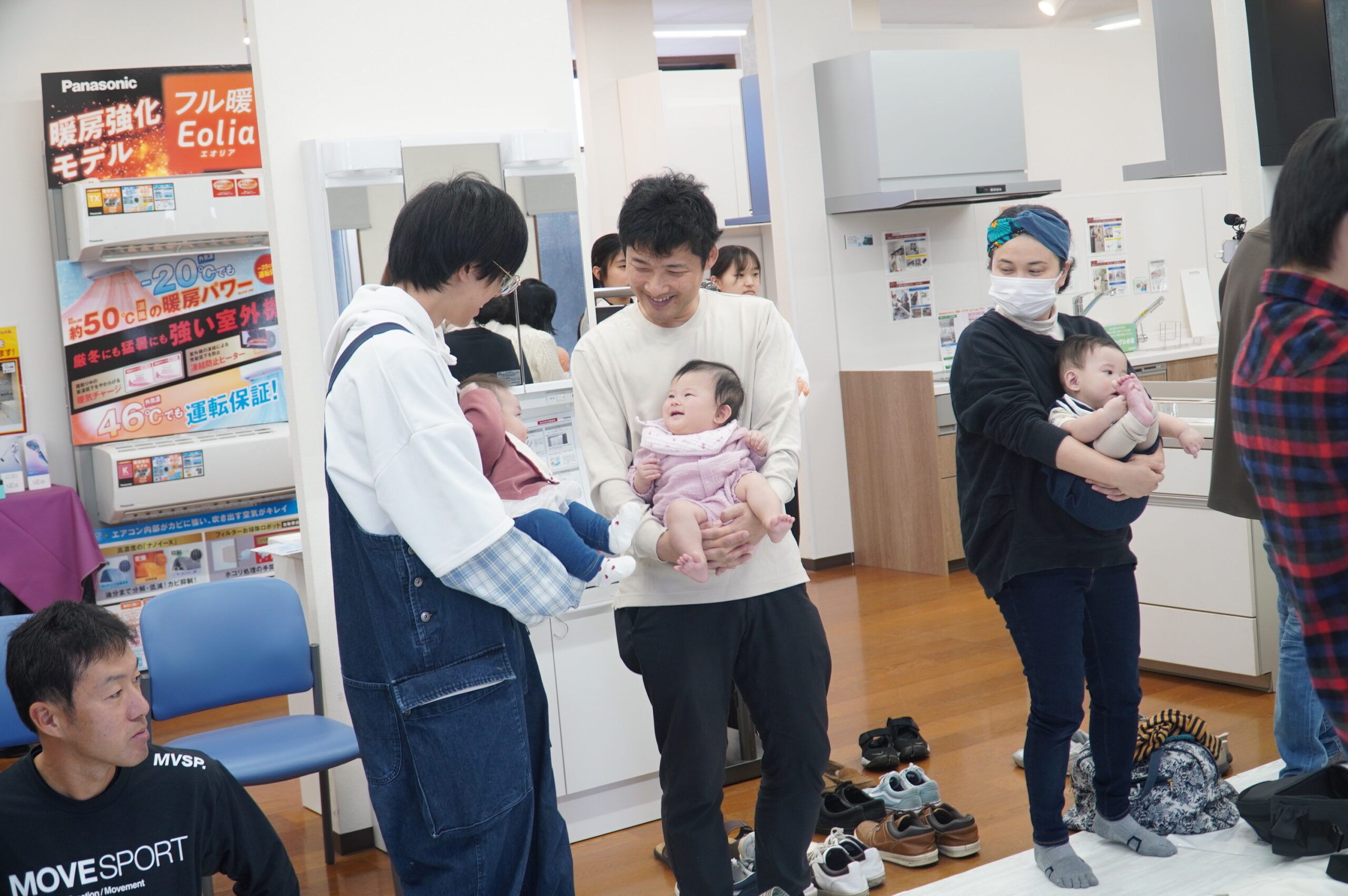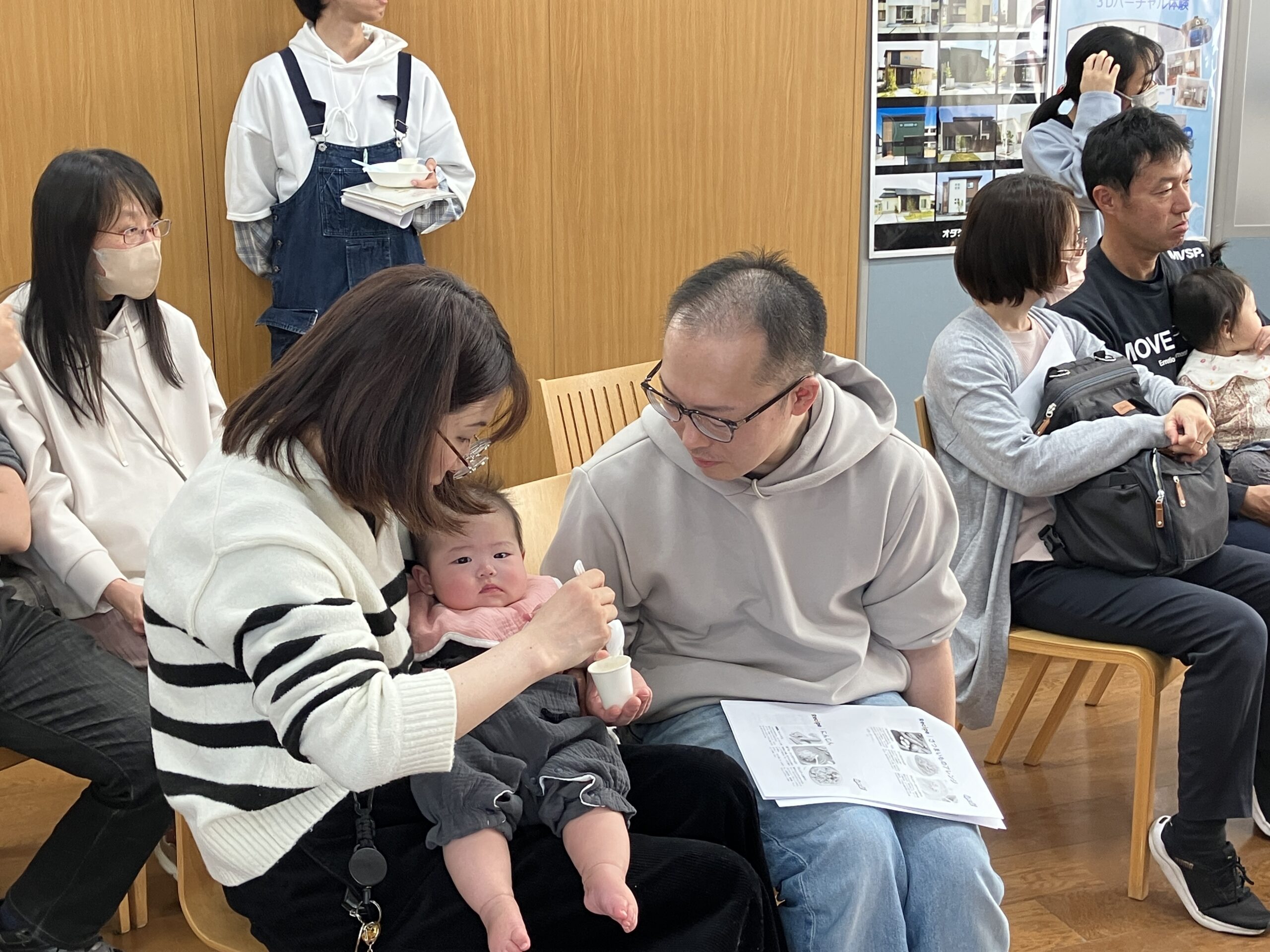 首座り前の赤ちゃんは、首をしっかり支えてあげる事が大切。首すわり以降の赤ちゃんには、遊びとしても取り入れられる抱き方が紹介され、 赤ちゃんが喜ぶ姿にパパママが優しく微笑まれている姿が見られました。