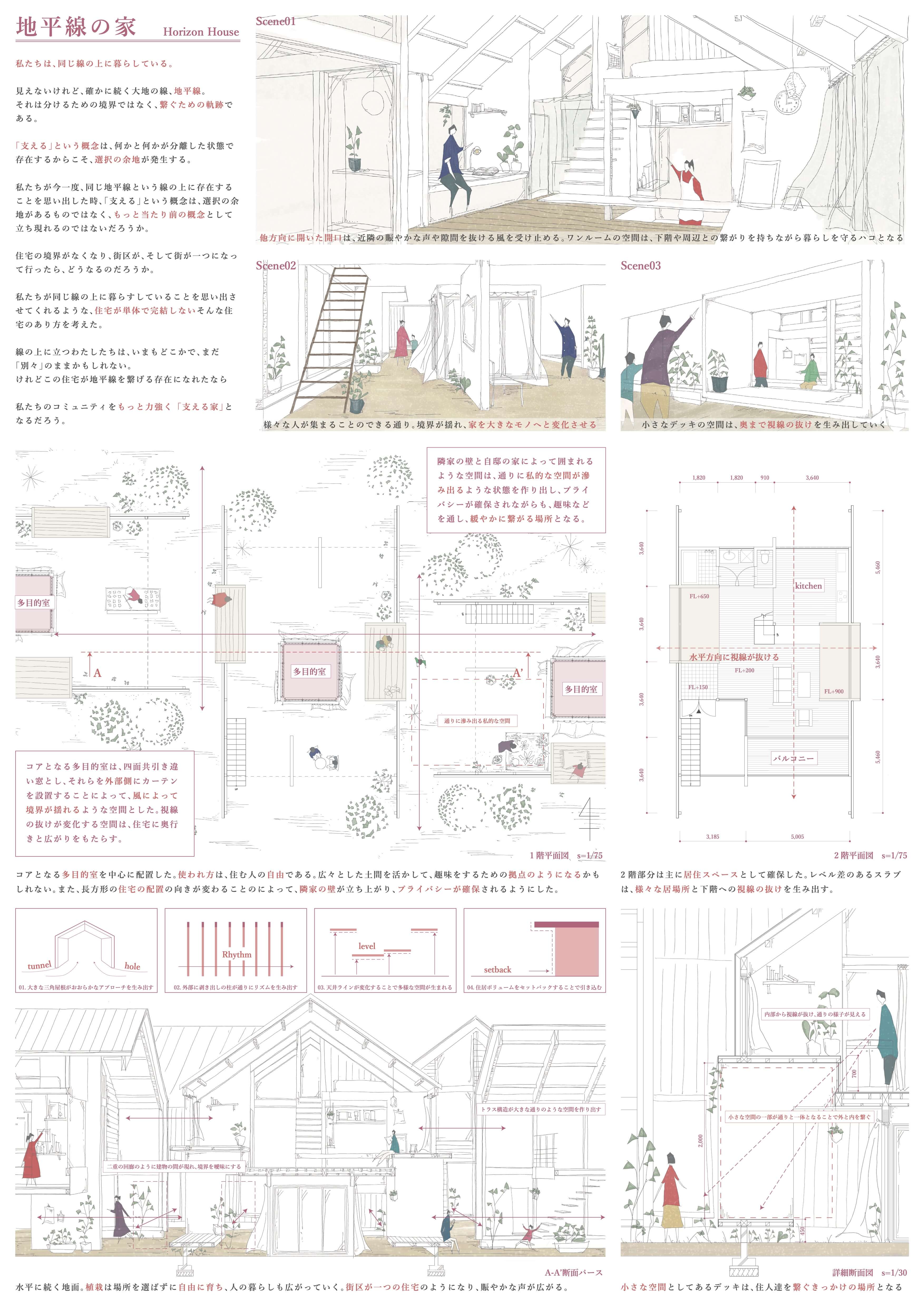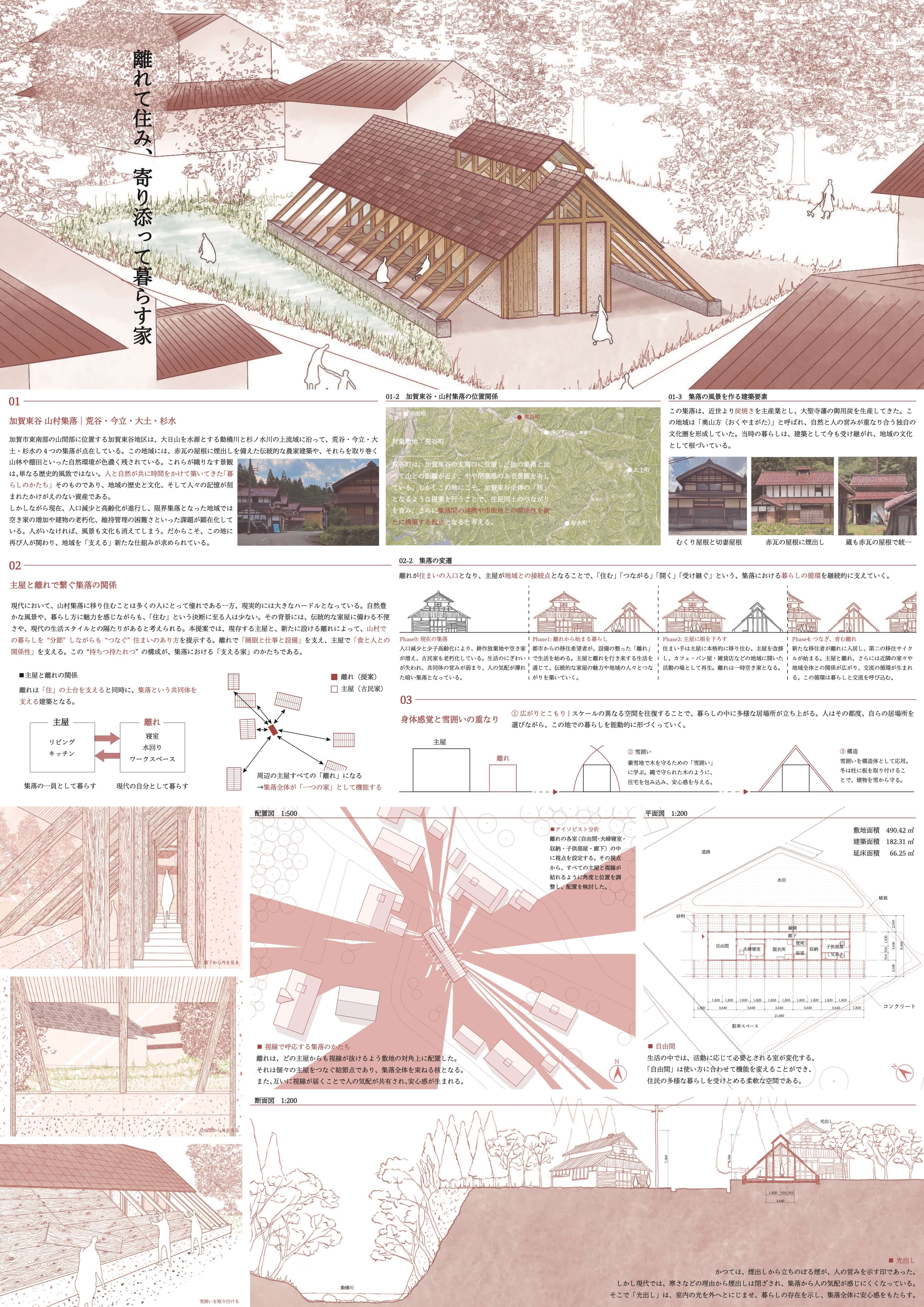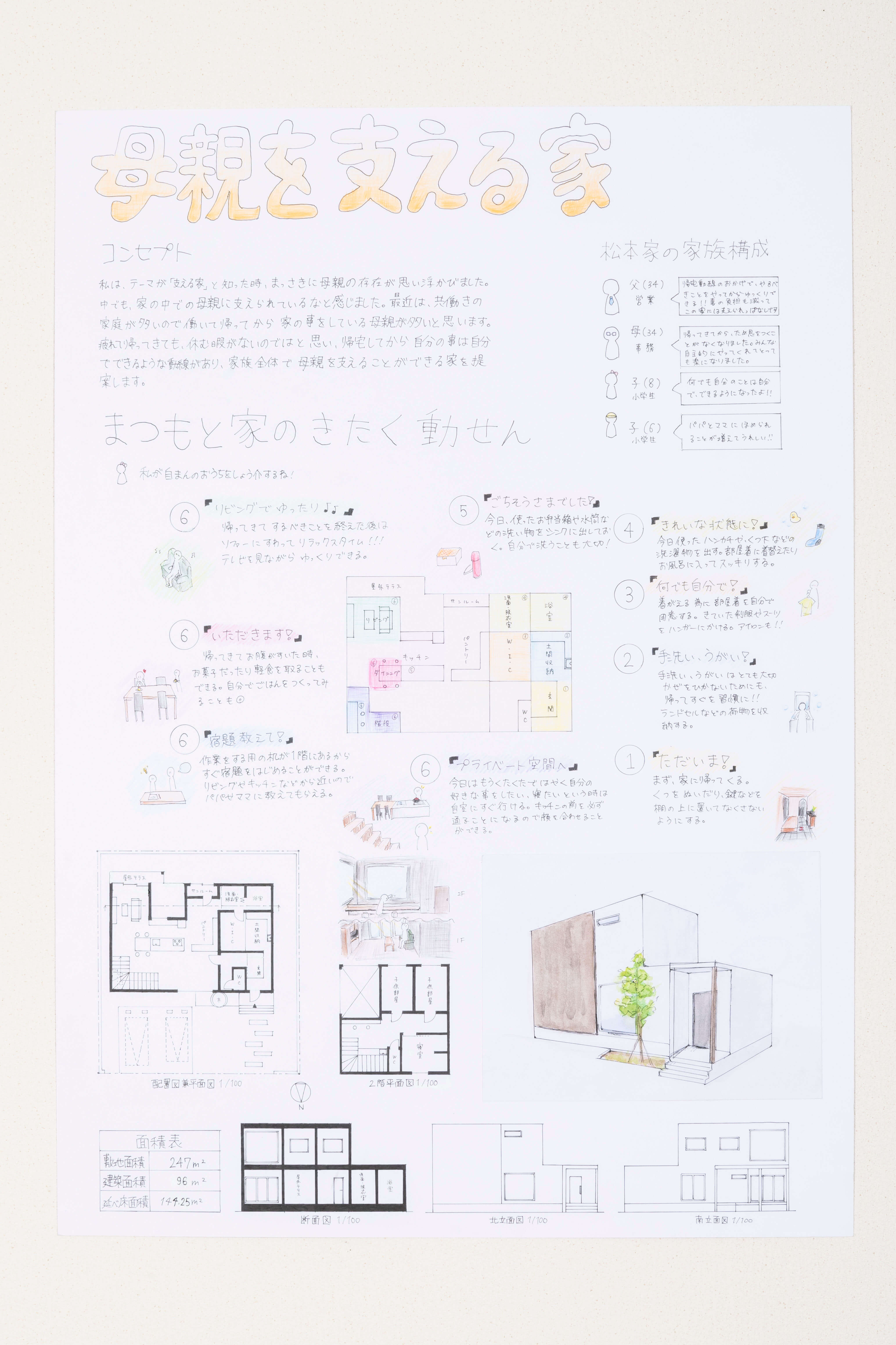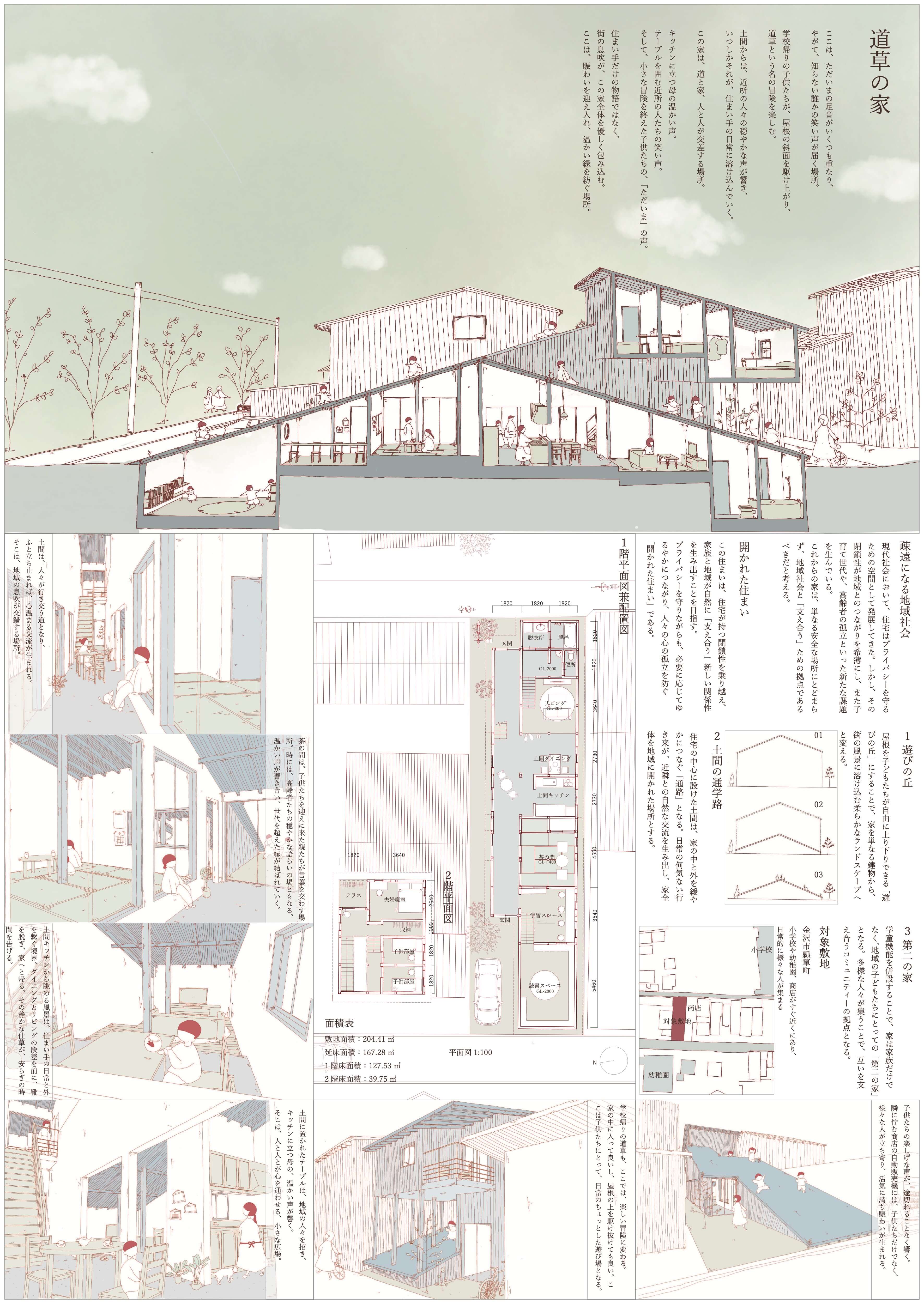 なたが広い草原にぽつりと立っているとしたら、どんな気持ちでしょう。ちょっと不安な気分になりませんか。でもそこに一本の樹が立っていたとしたら、樹は心地よい木陰をつくり、草原に腰を下ろすきっかけをつくってくれるでしょう。そんな時、樹は、私たちに居場所と安心を与えてくれる頼りがいのある存在として感じられるはずです。 では、私たちにとって家とはどんな存在でしょう。日差しや雨、風、暑さや寒さなどの自然がもたらす影響から私たちを守ってく れるもの。安心できる居場所。人生の記憶を刻み込む場所。名前や顔と同じように、私たちそれぞれの固有性を保証してくれるもの。家族や地域、社会と私たちをつないでくれるもの、などなど。家には様々な役割があります。 それらを合わせて考えてみると、家は私たちを様々なかたちで支えてくれる存在と言っても良いのではないでしょうか。屋根や床、壁が、私たちの生活や身体を物理的に支えてくれることもあれば、家という存在が、地域や社会の中に生きる私たちの存在を支えてくれることもあるでしょう。家での経験や記憶は、私たちの自己形成を大きく支 えてくれているはずです。 今年のテーマは「支える家」です。皆さんは家に何を支えてもらっているでしょうか。あるいは、家に何を支えてもらいたいでしょう。物理的なことでしょうか、それとも精神的なことでしょうか。支えられるだけでなく、私たちが家や家族、地域や社会を支えることを考えても良いでしょう。支える対象が地球環境にまで広がるかも知れません。どんな「支え」や「支え方」があるか、様々に想像を膨らませてみてください。 「支える」というキーワードを通して「家って何だろう?」ということを改めて考え、家の存在や意味に対する 新しい気づきが生まれることを期待しています。 上記のテーマに加えて、以下の3点にも配慮した提案としてください。