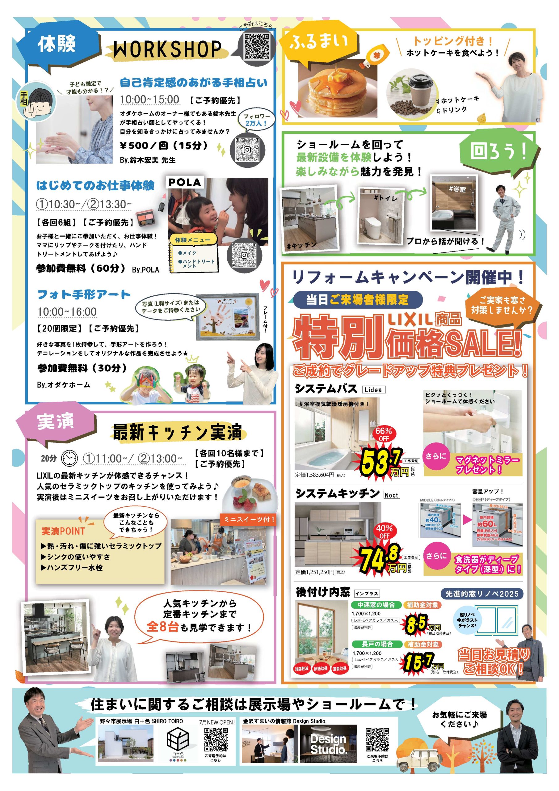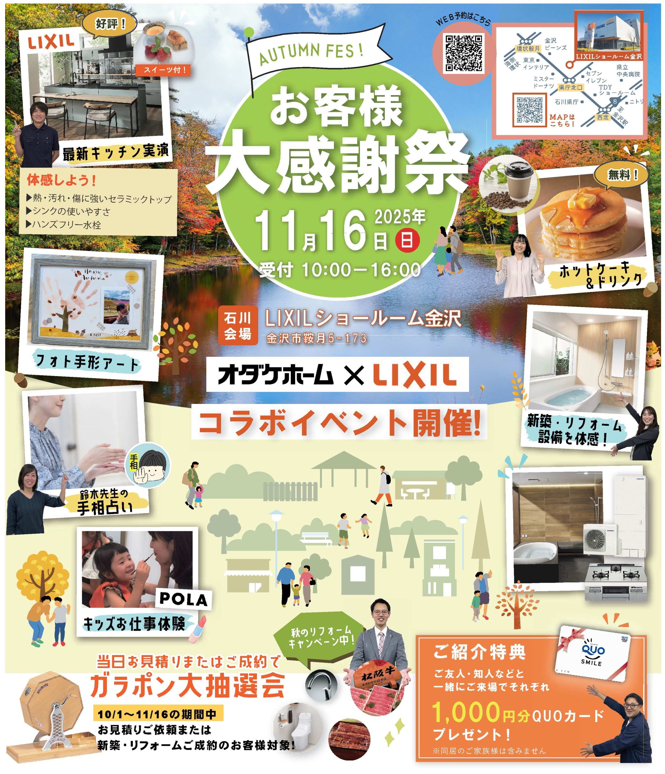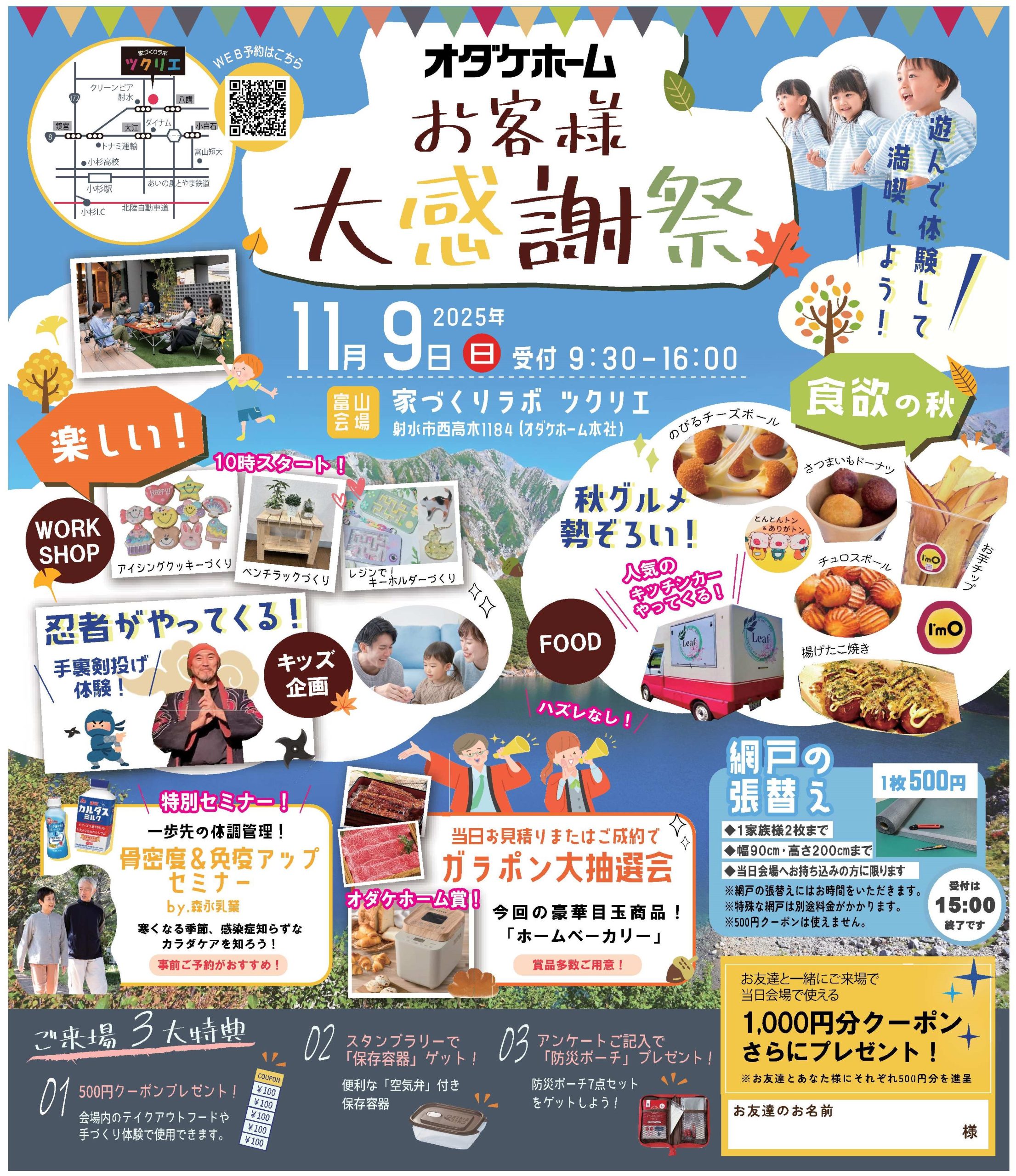 富山11/9(日)・石川11/16(日) 富山会場、石川会場によって日程や開催内容が異なります。 富山会場 家づくりラボ ツクリエ(オダケホーム本社) 石川会場 LIXILショールーム金沢 ★ご来場予約は10/18(土)スタート! 参加希望の方は下記フォームよりお申し込みください。送信にあたっては事前に本サイトにおける「個人情報保護方針」をご確認ください。 【重要1】お申込み後、入力されたアドレスに自動で返信メールが届きます。ご確認をお願いします。 【重要2】お申込み後、1週間以内に受付完了のお電話をさせて頂きます。必ず連絡の取れるお電話番号をご記入ください。 (※富山・石川、各会場によって開催内容が異なります。詳しくはチラシをご覧ください。) (※手作り体験ワークショップにお申込みの方には、受付の可否と、確定した体験時間をお伝えいたします。お申込みの先着順にて、それぞれ限定数に達し次第受付終了となりますのでご了承ください。) お名前必須 フリガナ必須 メールアドレス必須 郵便番号必須 〒 - ご住所必須 北海道 青森県 岩手県 宮城県 秋田県 山形県 福島県 茨城県 栃木県 群馬県 埼玉県 千葉県 東京都 神奈川県 新潟県 富山県 石川県 福井県 山梨県 長野県 岐阜県 静岡県 愛知県 三重県 滋賀県 京都府 大阪府 兵庫県 奈良県 和歌山県 鳥取県 島根県 岡山県 広島県 山口県 徳島県 香川県 愛媛県 高知県 福岡県 佐賀県 長崎県 熊本県 大分県 宮崎県 鹿児島県 沖縄県 電話番号必須 - - 招待状 招待状の送付 希望する 不要(持っている) オダケホームとの関係 オダケホームとの関係を教えてください オダケホームで新築・リフォームした(オーナー様) 社員の知人 以前オダケホームのイベントや見学会等に行ったことがある ママスキーイベントに参加したことがある その他 特に関係はなし きっかけ このイベントを何で知りましたか? 招待状が届いた 社員から聞いた HP facebook instagram ママスキー KNB女性セミナー その他 ご来場会場必須 富山会場:オダケホーム本社 石川会場:LIXILショールーム金沢 実演&セミナー 富山会場 ★実演・セミナーはご希望の参加時間を下部「その他」にご入力ください。 【富山会場】「骨密度&免疫アップセミナー」 人数 1 2 3 4 名 【石川会場】「最新キッチン実演」 人数 1 2 3 4 名 手作り体験 ご希望のワークショップや体験を選択してください。 ワークショップご予約受付中!〇空きあり △残りわずか ×満席 【富山会場】「アイシングクッキー」づくり 1 2 3 4 個 第1希望時間 10:00〇 10:30〇 11:00△ 11:30〇 13:00〇 13:30〇 14:00〇 14:30〇 15:00〇 第2希望時間 10:00〇 10:30〇 11:00△ 11:30〇 13:00〇 13:30〇 14:00〇 14:30〇 15:00〇 【富山会場】「レジンで!キーホルダー」づくり 1 2 3 4 個 第1希望時間 10:00△ 10:30〇 11:00〇 11:30〇 13:00〇 13:30〇 14:00〇 14:30〇 15:00〇 第2希望時間 10:00△ 10:30〇 11:00〇 11:30〇 13:00〇 13:30〇 14:00〇 14:30〇 15:00〇 【富山会場】木工教室「ベンチラック」づくり 1 2 3 4 個 第1希望時間 10:00× 11:00× 12:00〇 13:00〇 14:00〇 15:00〇 第2希望時間 10:00× 11:00× 12:00〇 13:00〇 14:00〇 15:00〇 【石川会場】自己肯定感のあがる「手相占い」★ご予約完了時に体験時間をお伝えいたします 1 2 3 4 人数 第1希望時間 10:00× 11:00△ 13:00〇 14:00〇 第2希望時間 10:00× 11:00△ 13:00〇 14:00〇 【石川会場】POLA「はじめてのお仕事体験」各回6組まで 1 2 3 4 組 第1希望時間 10:30〇 13:30〇 第2希望時間 10:30〇 13:30〇 【石川会場】「フォト手形アート」づくり 1 2 3 4 個 第1希望時間 10:00〇 10:30〇 11:00〇 11:30〇 13:00〇 13:30〇 14:00〇 14:30〇 15:00〇 15:30〇 第2希望時間 10:00〇 10:30〇 11:00〇 11:30〇 13:00〇 13:30〇 14:00〇 14:30〇 15:00〇 15:30〇 【その他】ご質問・メッセージ ★実演やセミナーの参加ご希望時間を記載ください