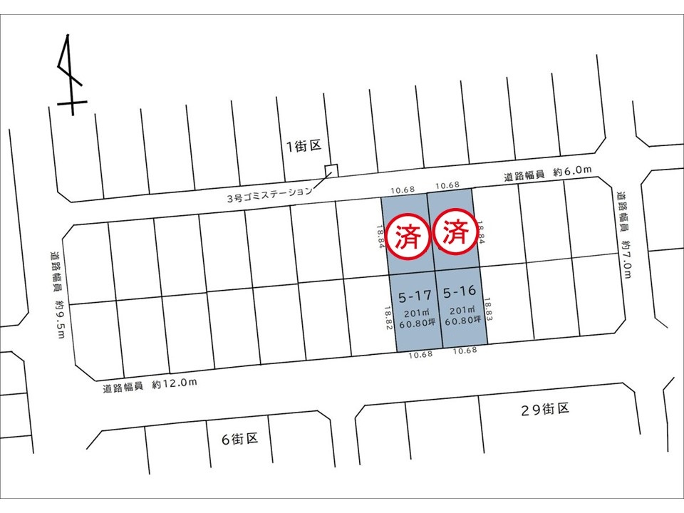 | 道路 | 接道:【5-16、5-17】南側公道約12m、間口約10.68m【16ー7】東側公道約6.0m 間口約12.0m、【19-12】西側公道約6.0m 間口約12.80m | 建築条件 | あり |