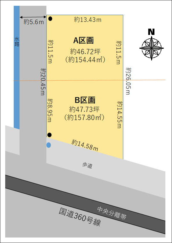 道路 | A区画:西側(幅員約5.6m)舗装道路 B区画:西側 約8.95m(幅員約5.5m)、南側14.58m(幅員約25m) 舗装道路 | 建築条件 | あり |