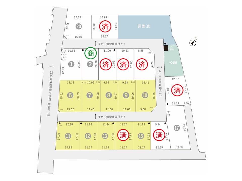 | 道路 | 区域外:公道深江神島線 幅員5.5m~8.7m(舗装道路) 区域内:公道幅員:6m(舗装道路) | 建築条件 | あり★№6~№15(オダケホーム株式会社) |