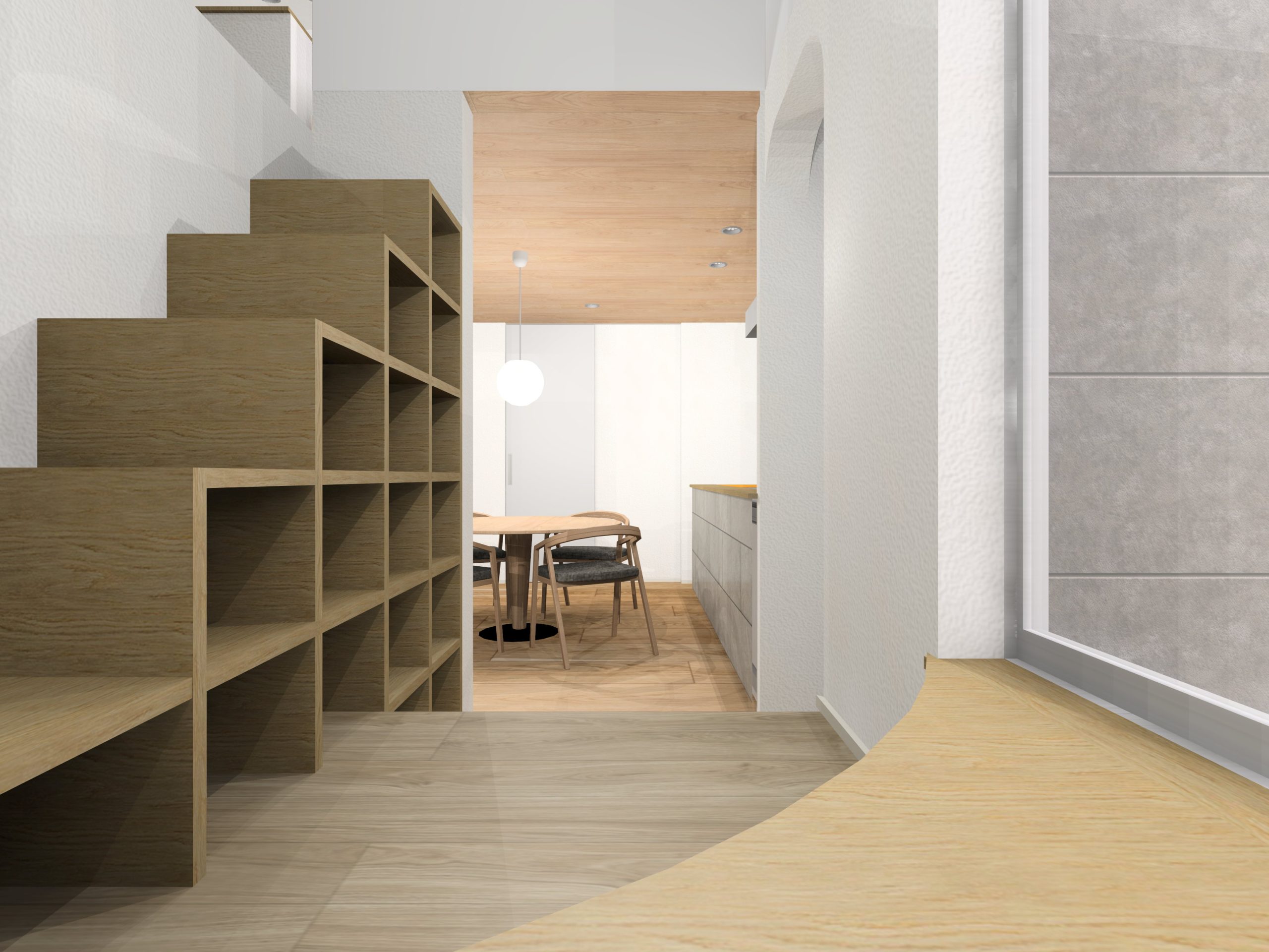 ④玄関ホールからファミリーロッカー→ユーティリティ→キッチンへの動線をつくり、家事のしやすさに配慮。