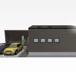 ⑤外観は、シックなダークグレーと木目の斜め壁が印象的な外観。