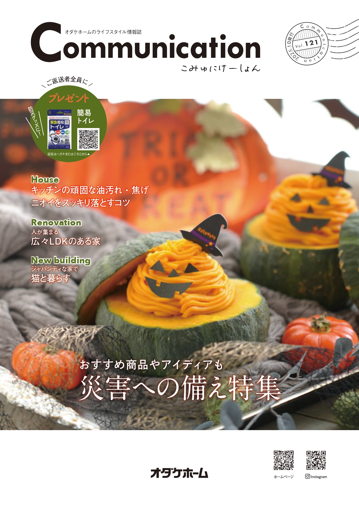 ごあいさつ・News(P1) 住まいの維持管理法「油汚れ・焦げ・ニオイをスッキリ落とすコツ」」(P2) リノベーション実例(P3) 新築実例(P4) 私の災害対策(P5・6) わいわい広場(P7) プレゼント・クイズ・つぶやき(P8)